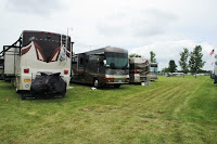 We arrived on Sunday to a long line of motorhomes waiting to enter the grounds. Parking was held up for several hours hoping that the ground would dry out some from the heavy rains the night before. The grounds were formally farm fields of rich Iowa soil. This means that they can become quite soft. Not the best conditions for a coach weighing in at over thirty thousand pounds. We were finally parked without incident and watched as others maneuvered into spots. Since it is still a week before the official start of the rally, the grounds are still lightly populated. Since arriving we have already had the chance to visit with numerous folks we have met in the last month or so from two state rallies and our WIT rally to Springfield and Chicago.